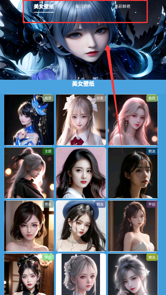 1、进入首页,按照选项选择壁纸种类,点击进入即可选择精美图片。