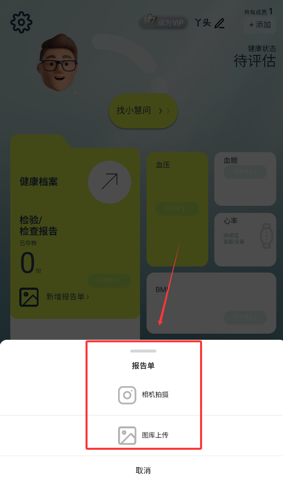 1、进入首页,点击健康档案,拍照于健康报告上传于页面,即可开始监察身体情况。