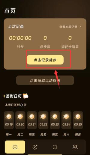 1、登录应用后,在首页选择"徒步记录"功能进入运动追踪页面。