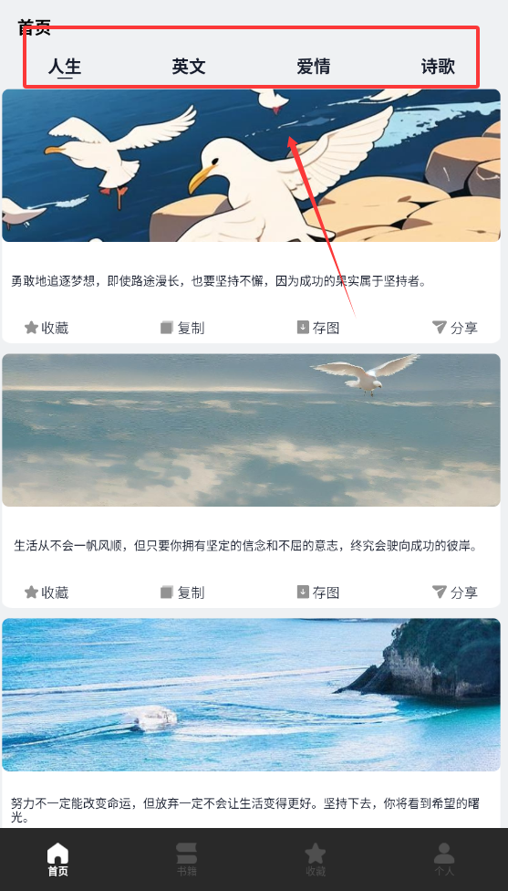 2、支持个性化收藏功能,用户可以随时保存喜欢的句子或文章,方便日后反复回味汲取力量。