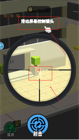 2、滑动屏幕控制瞄准镜移动,长按开火按钮进行射击,在合适时机完成击杀任务,注意避开敌人视线避免暴露位置。