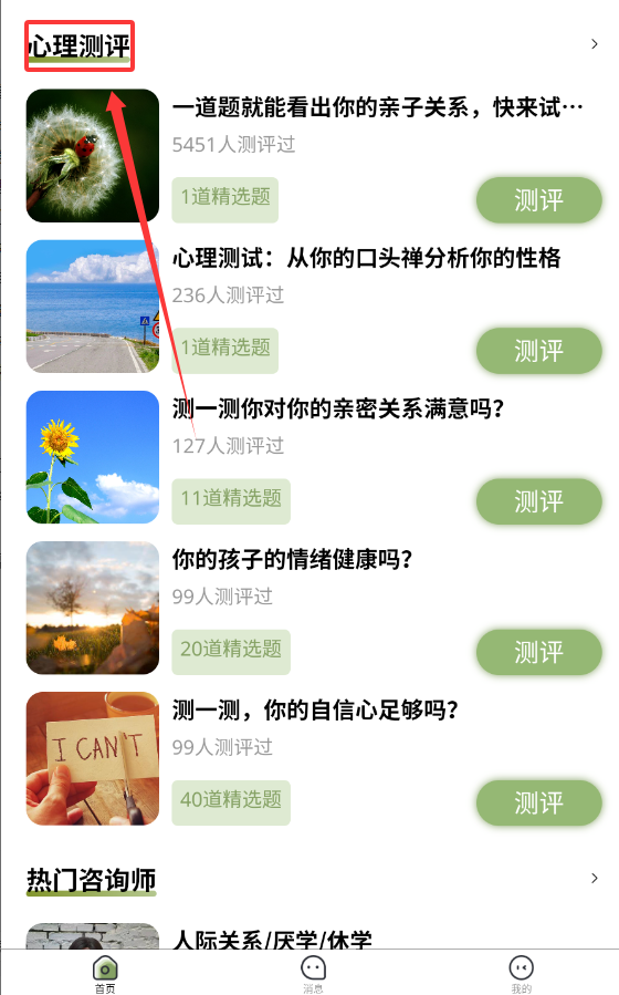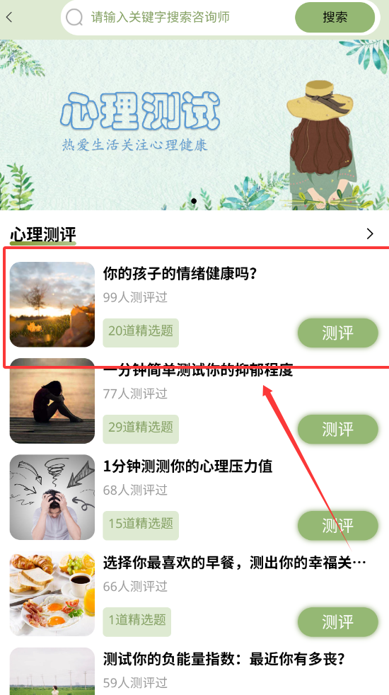 2、心理测评板块包含二十余套专业问卷,测试完成后自动生成包含风险提示与建议措施的十页图文报告。