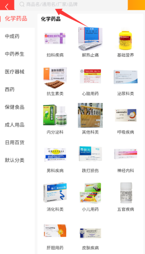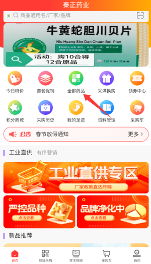 1、进入秦正药业APP后,在首页选择"全部药品"栏目,浏览各类医药商品分类列表。