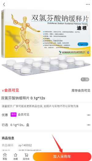 3、在药品详情页点击"加入购物车"按钮,商品将自动保存至您的采购清单中。