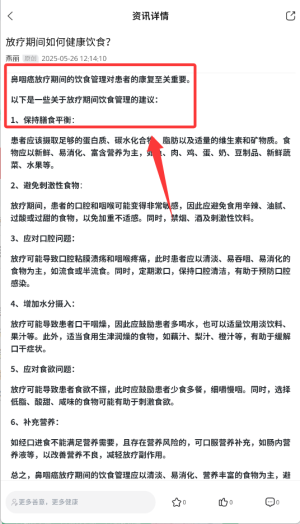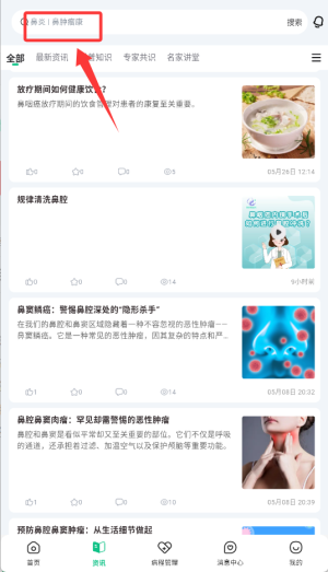 2、通过"健康资讯"栏目搜索关键词,快速查找术后调理、饮食管理等康复知识。