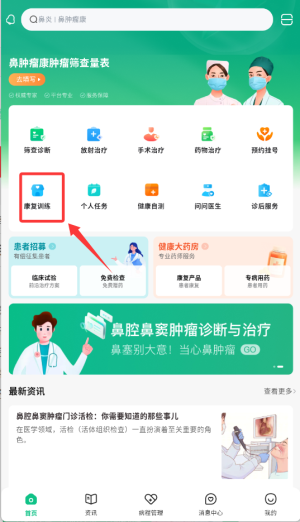 1、启动鼻肿瘤康APP后,在首页选择"康复指导"板块,查看专业护理建议和训练课程。