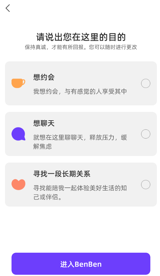 1、BenBen采用智能兴趣匹配算法,通过分析用户的兴趣爱好和行为习惯,精准推荐志同道合的社交伙伴,让交友更高效。