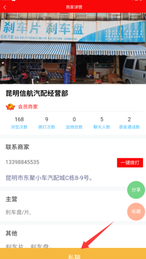 3、选中商品后点击"私聊"按钮,通过私聊功能与商家咨询配件详情或议价。