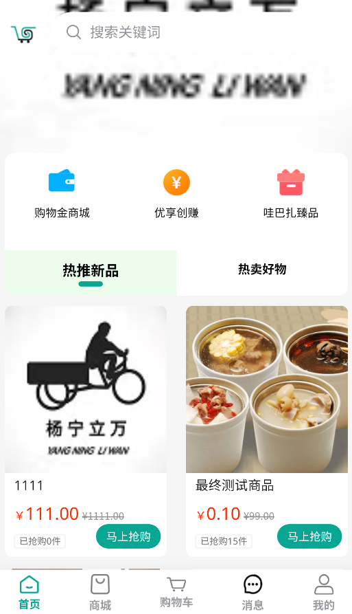 1、启动哇巴扎APP后,首页展示"购物金商城"、"优享创赚"等特色购物专区,可直接选购商品。