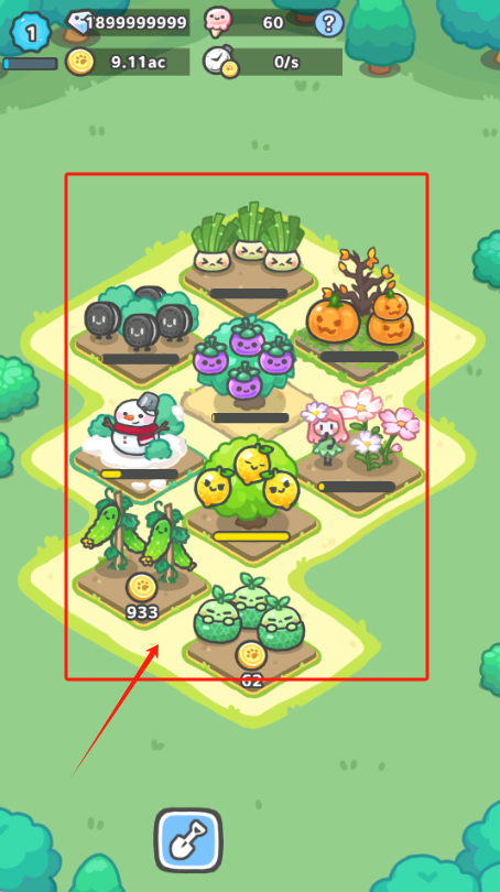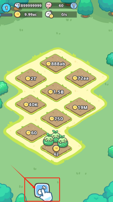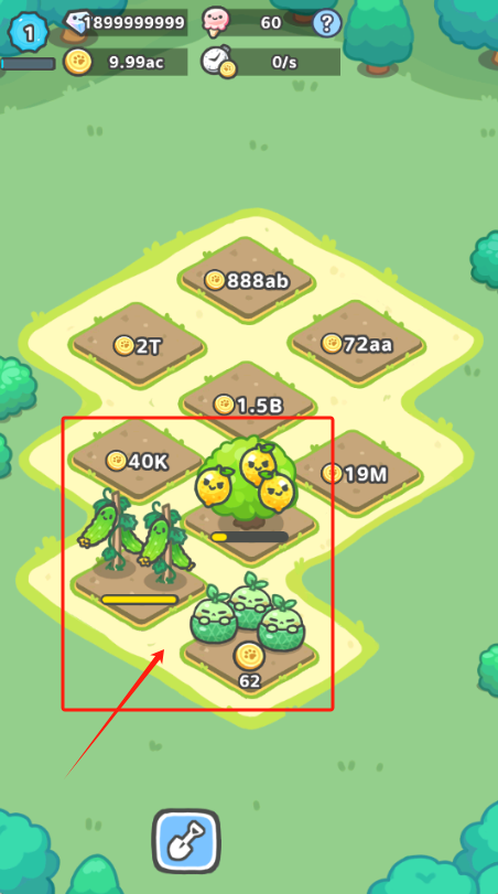 2、红框内是成熟作物,点击40K,19M,62这些数字就能收取对应农产品。