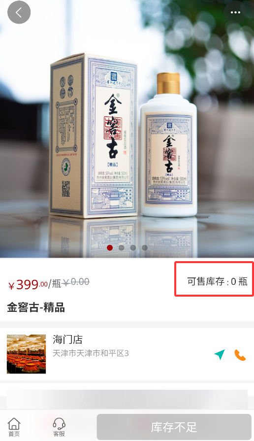 2、进入商品详情页可实时查看库存状态,支持在线下单购买心仪酒品。