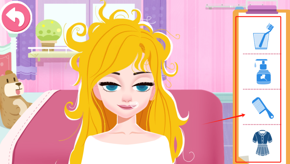 3、给脸上有泡沫的金发女孩选右边的梳子梳头发。