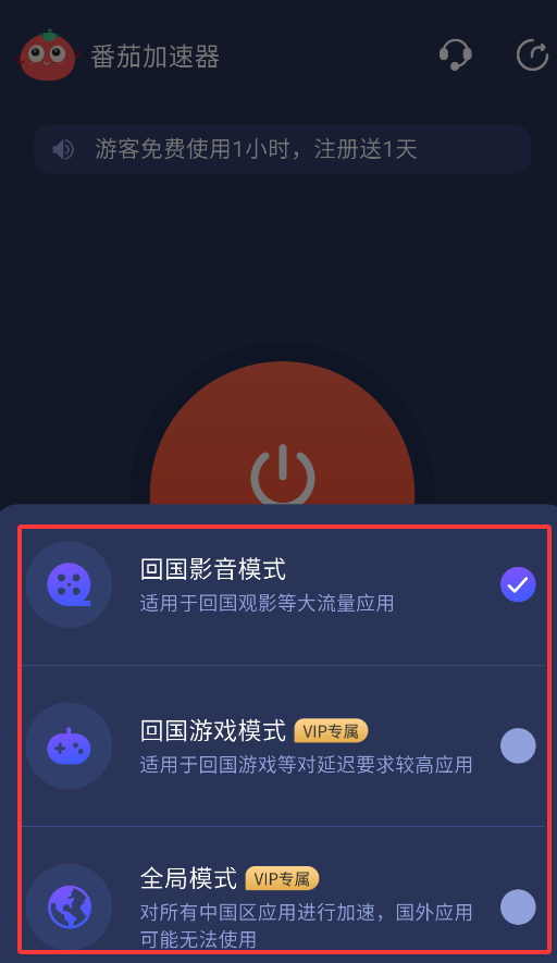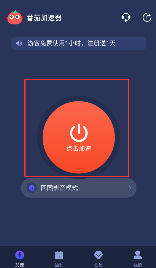 1、启动APP后,在首页根据需求选择"影音加速"、"游戏专线"或"全局模式"等优化方案。