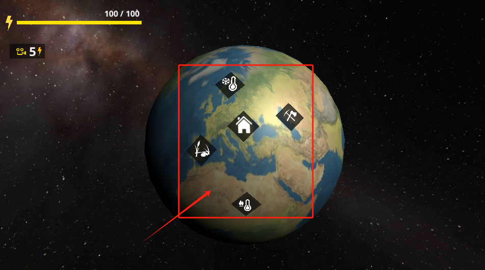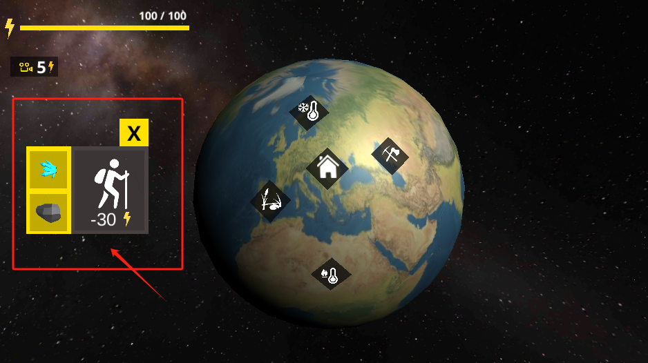 2、闪电图标显示电量100/100,数字5是金币,红框里是可选地点。