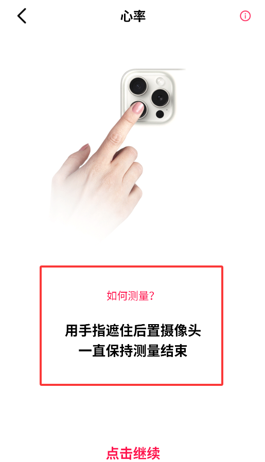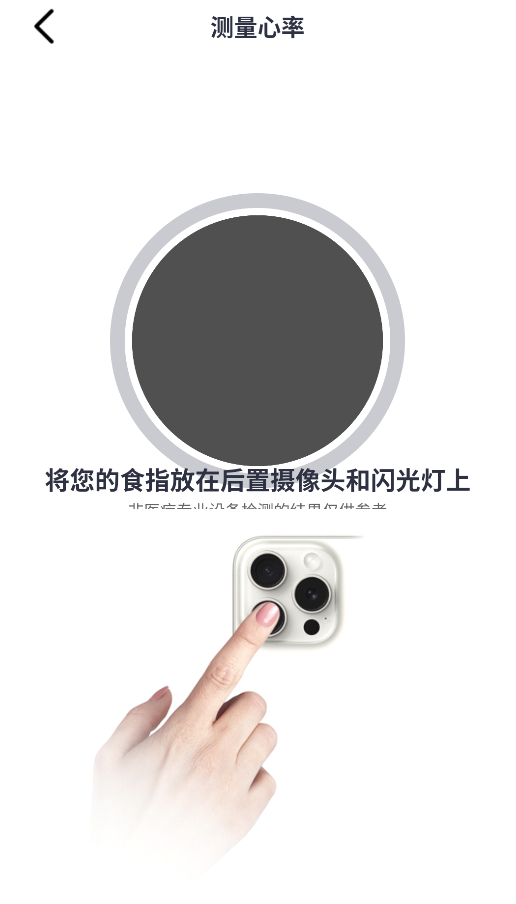 1、启动APP后,点击首页"心率检测"按钮,系统会显示详细的操作指引图示。
