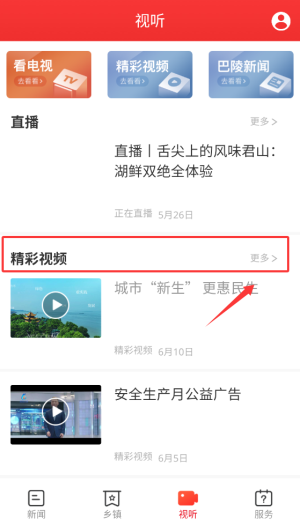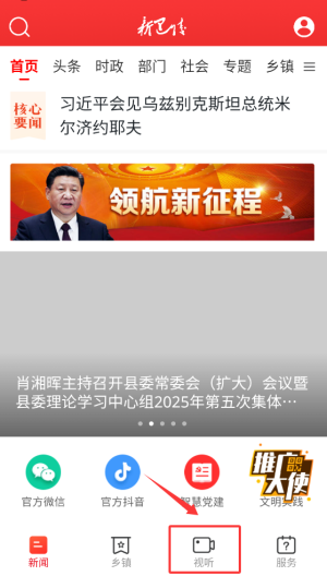 1、启动新巴陵新闻APP后,在首页导航栏选择"视听"栏目,这里汇聚各类视频新闻报道。