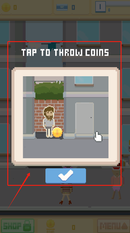 1、点TAP TO THROW COINS扔金币给乞丐,点对勾确认,右下角有商店按钮。
