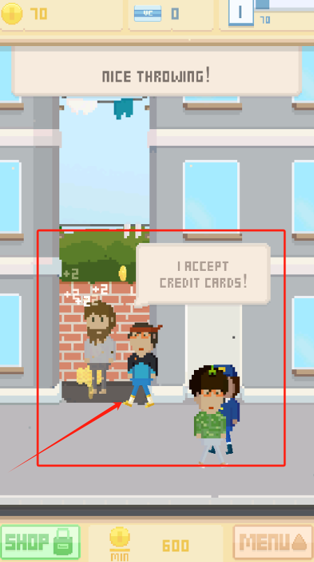2、扔金币技巧好显示NICE THROWING,红框里人收信用卡,金币有600个。