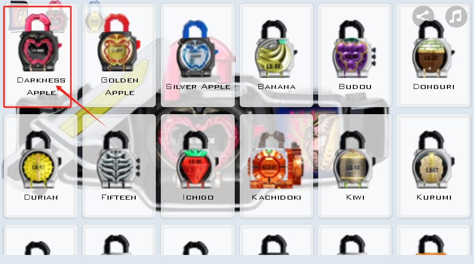 3、上面一排是各种水果锁,下面还有更多款式,点哪个就能选对应的变身道具。