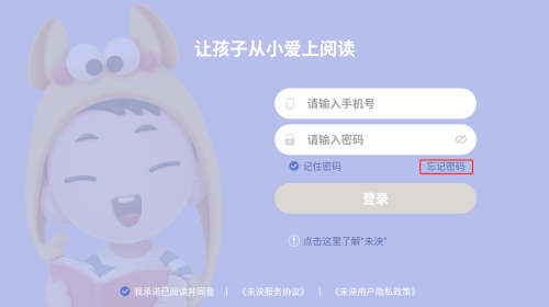 1、若遗忘登录密码,可在未泱阅读APP登录页面点击"找回密码"选项,进入密码重置流程。
