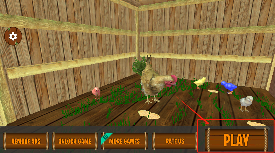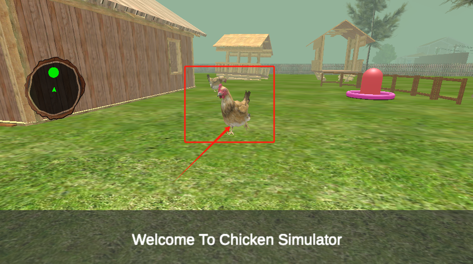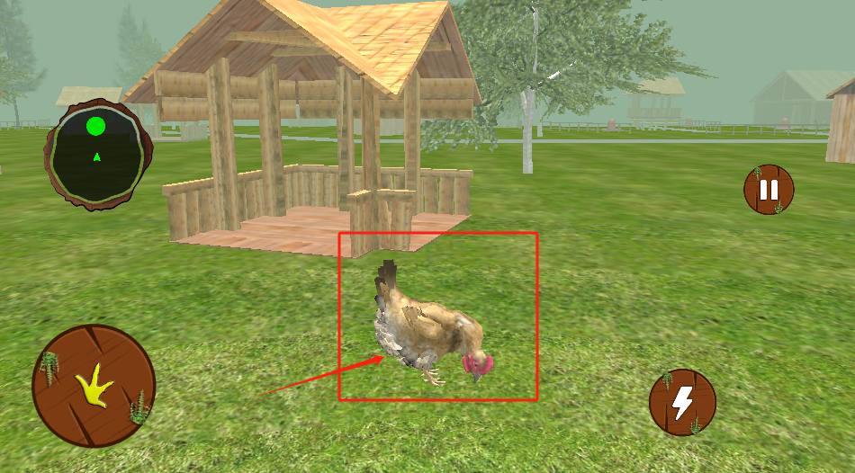 2、游戏主场景,红框里的鸡可以控制移动,左侧木屋是存档点。