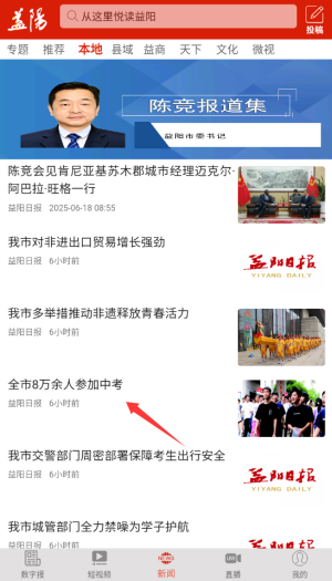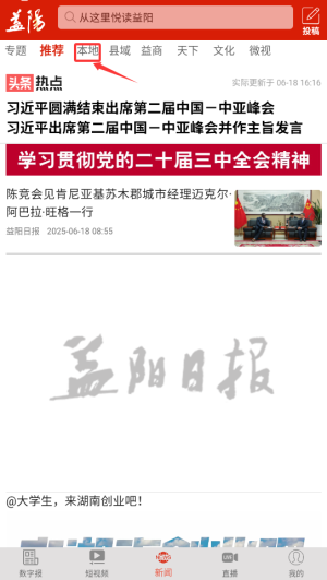1、进入大益阳APP后,在首页导航栏选择"本地资讯"栏目,这里每日更新益阳地区新闻动态。