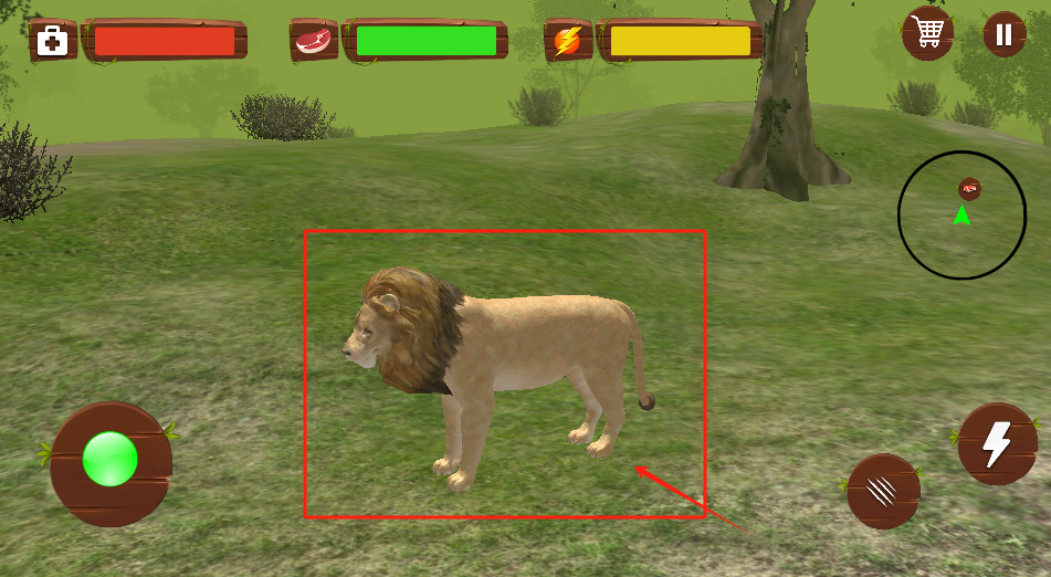 3、操控红框里的狮子移动,使用屏幕上的操作按钮进行狩猎和探索。