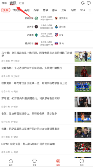 1、启动疯狂体育APP后,在首页导航栏选择"资讯"栏目,这里每日更新全球赛事动态。
