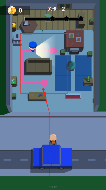 3、控制角色躲开蓝帽子警卫,偷红框里的物品,上面显示是第二关,有三星评价。