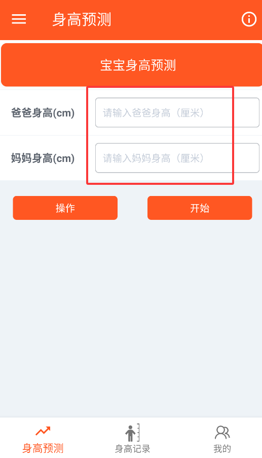 1、启动APP后,进入“身高预测”功能,输入父母身高(厘米单位),系统自动匹配遗传算法模型。