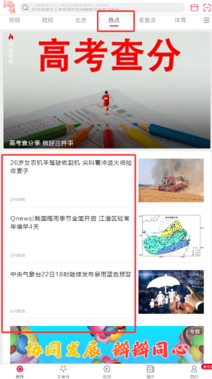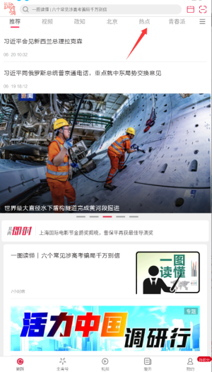 1、进入北京青年报APP后,在导航栏中找到"热点"频道并点击进入。