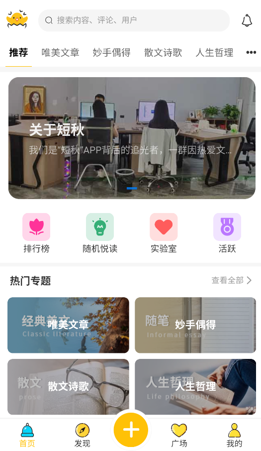 1、打开应用后,首页精选"唯美文集"、"人生哲思"等优质短篇内容,每日更新散文、诗歌等不同体裁的文学作品。