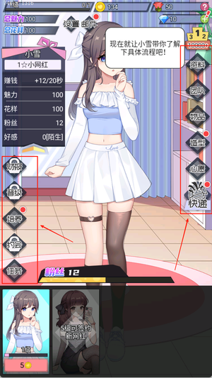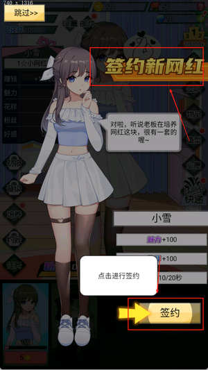 1、玩家可以从众多美少女中挑选心仪对象开始养成,点击签约后便可安排训练课程、参加节目与直播提升知名度与影响力。