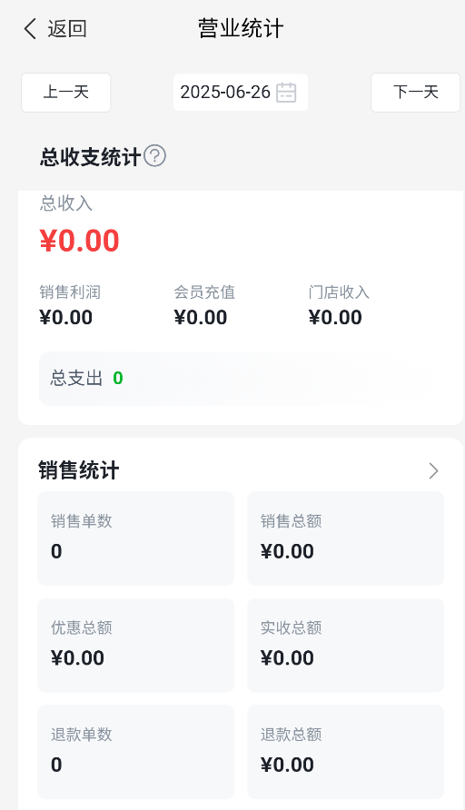 1、打开应用后,首页实时显示当日营业额概览,并提供快捷入口进入收银台和库存查询功能,方便快速处理门店业务。