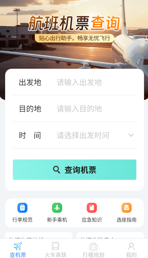 1、打开应用后,在"机票查询"界面输入出发城市、到达城市及出行日期,系统会实时显示所有航班信息(含价格曲线图)。