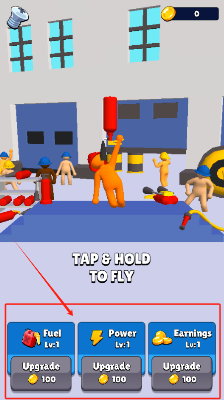 1、按住屏幕让小人飞起来,攒够100金币就能升级燃料动力或收益。