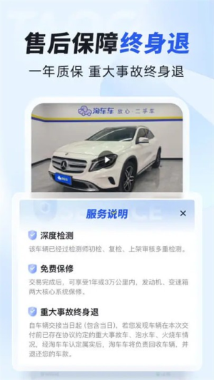 3、行业领先的售后保障体系,提供1年或3万公里超长质保服务,重大事故车承诺终身包退,彻底消除用户购车顾虑。