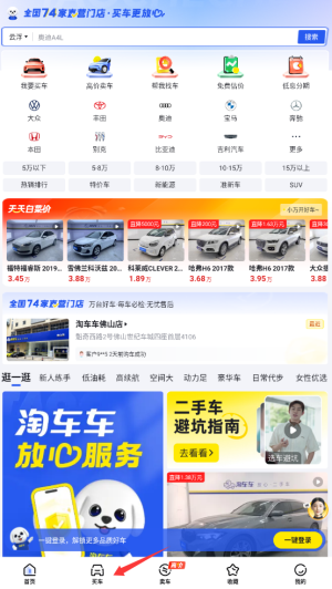 1、进入淘车车二手车APP后,在首页点击"买车"功能入口,浏览在售车辆列表。