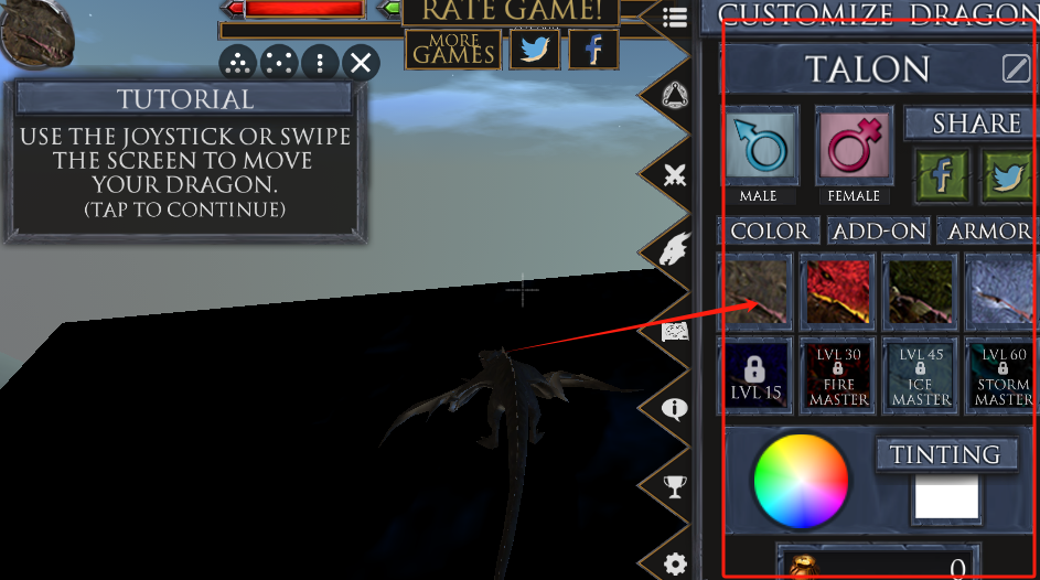 1、点开自定义界面,可以选性别颜色配件和护甲,打造你的专属飞龙。