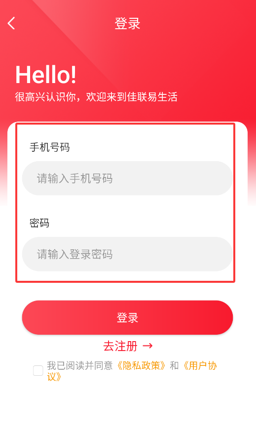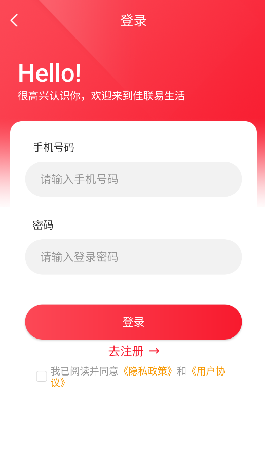 3、注册成功后返回登录页,输入已注册的手机号和密码,点击登录即可进入应用主界面。