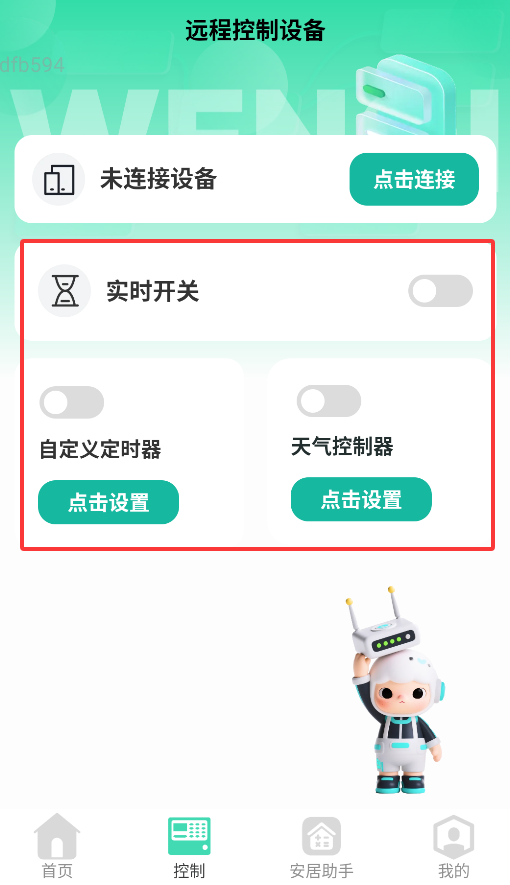 2、进入设备控制页面,支持远程开关操作,还能设置定时任务和智能天气联动功能。
