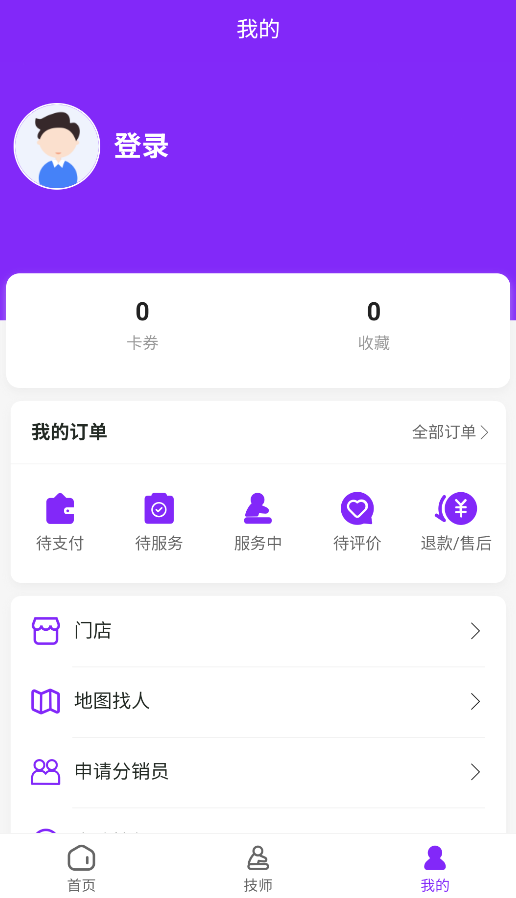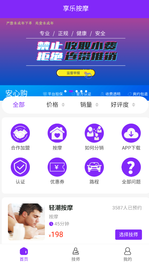 1、打开APP后,首页会展示各类按摩服务项目,同时提供合作加盟的相关信息入口。