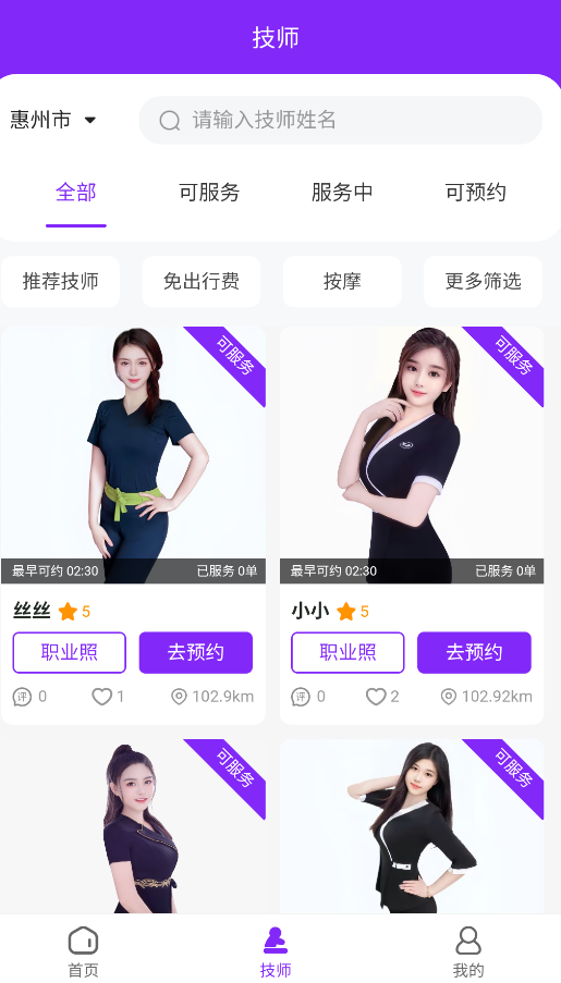 2、进入技师选择页面,可以查看可预约的技师列表,系统会智能推荐优质技师并显示优惠信息。