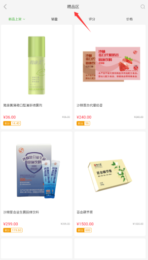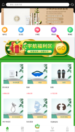 1、进入宇航商城APP后,在首页点击"精品区"选项,浏览精选商品分类。