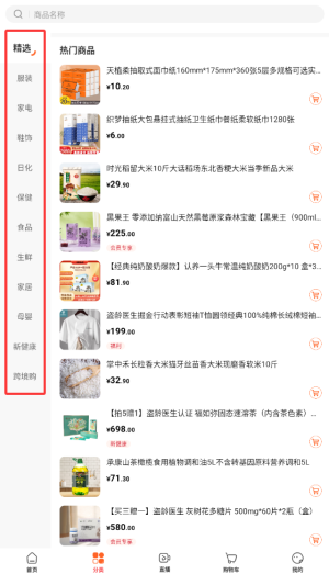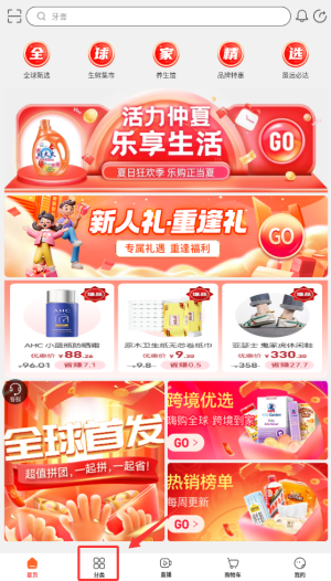 1、进入全球家精选APP后,在首页点击"分类"选项,浏览各类商品分类。