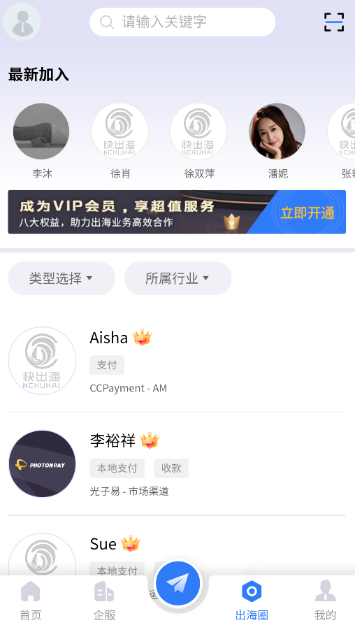 3、通过"出海社群"功能,能按行业类别筛选新加入的跨境企业,实时掌握同行生态。