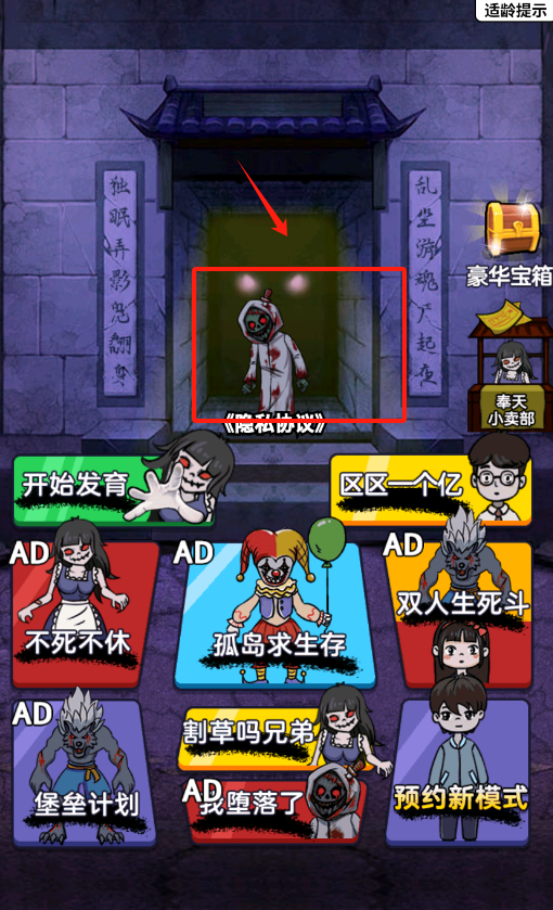 1、看到红框圈住的带血白衣角色,点他旁边的红色箭头,就能选这个诡异角色开始恐怖游戏啦。
