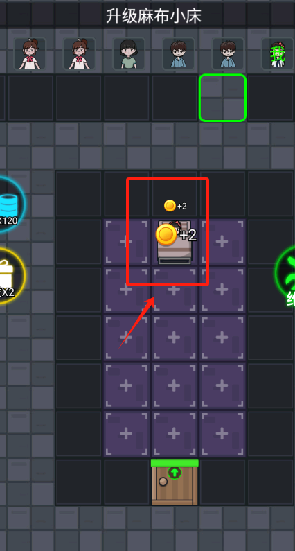 3、看到红框里的麻布小床和加2金币标识,点这个床就能花120金币给它升级提升属性呀。