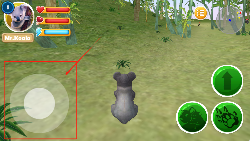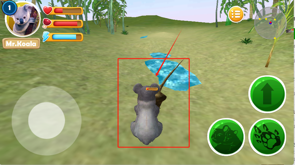 2、用左边红框摇杆控制考拉移动,注意看上方生命值。