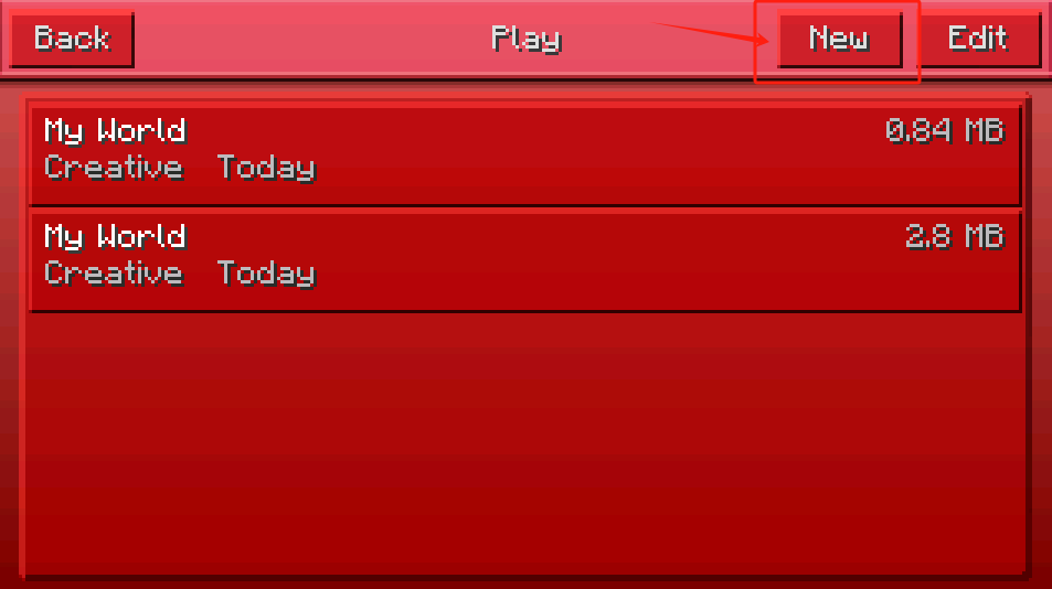 1、点红框里的New按钮创建新世界,下面两个是已有存档。